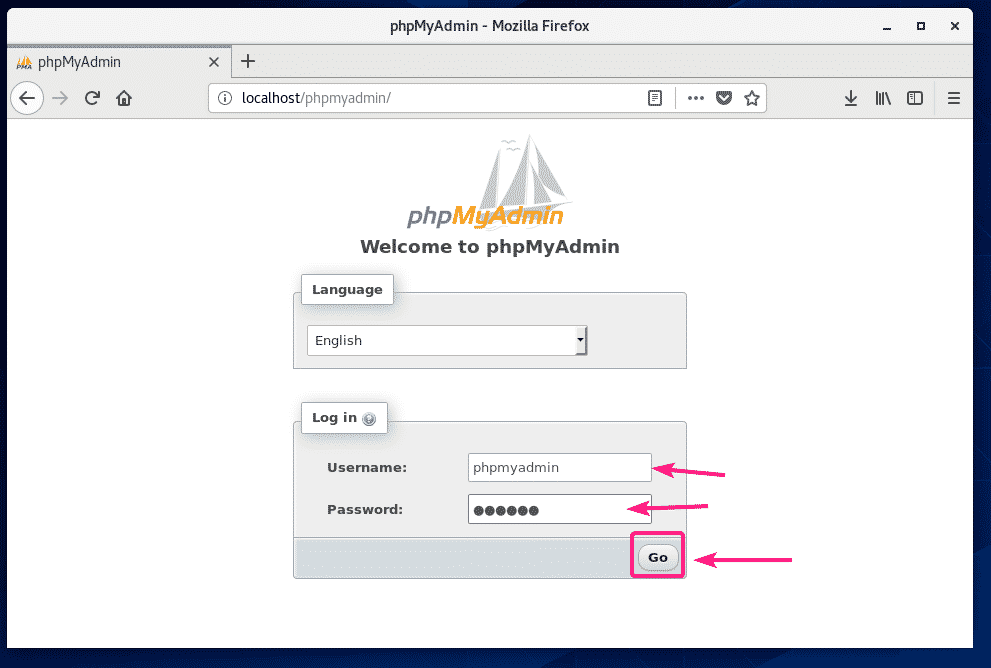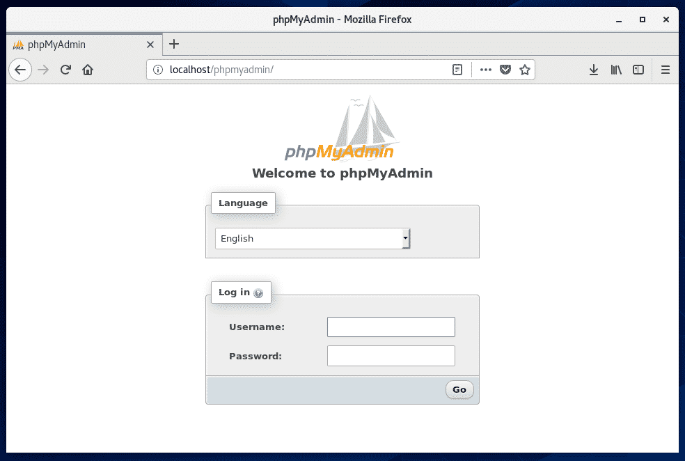 Now, visit http://localhost/phpmyadmin/ from your web browser and you should see the phpMyAdmin login page.