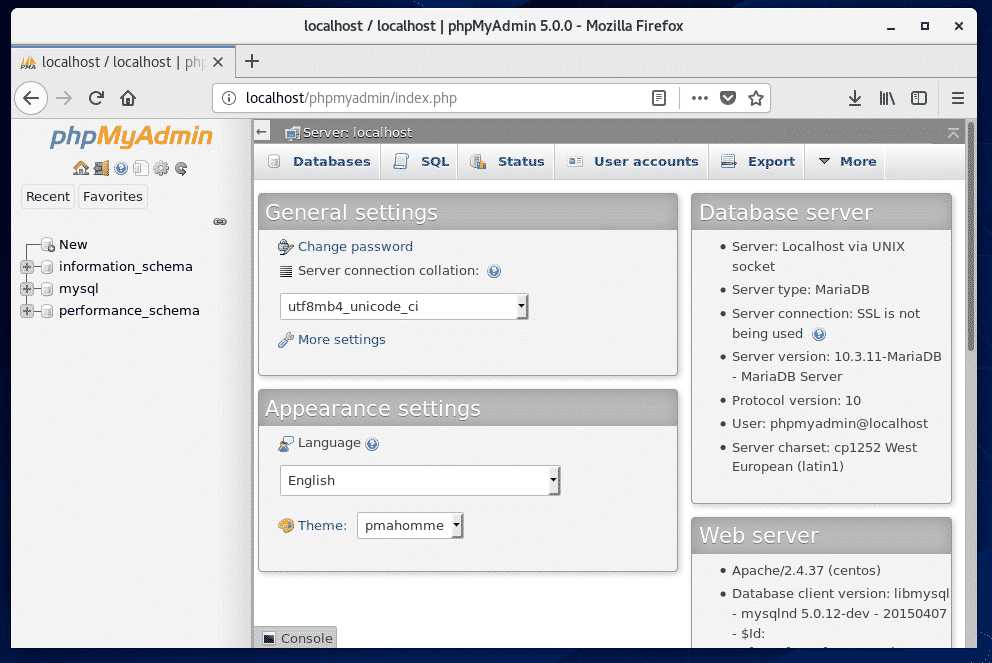 You should be logged in to phpMyAdmin. Now, you should be able to use phpMyAdmin to mange your MySQL/MariaDB database from your web browser.
