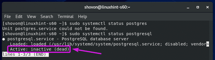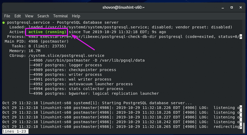 Once you start PostgreSQL database service, you can verify whether it’s running as follows: