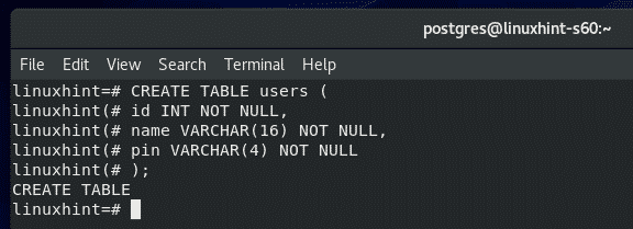 Here is the SQL statement to create the table users. Copy and paste the SQL statements in the PostgreSQL shell to create a new table users.
