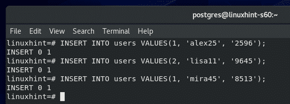 INSERT INTO users VALUES(1, 'mira45', '8513');
