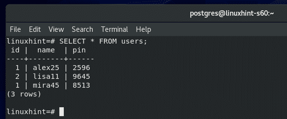 Now, to select all the rows from the users table and print them on the console, run the following SQL statement.