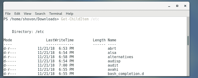 For example, to list the contents of the /etc directory (let’s say), run the Get-ChildItem command as follows: