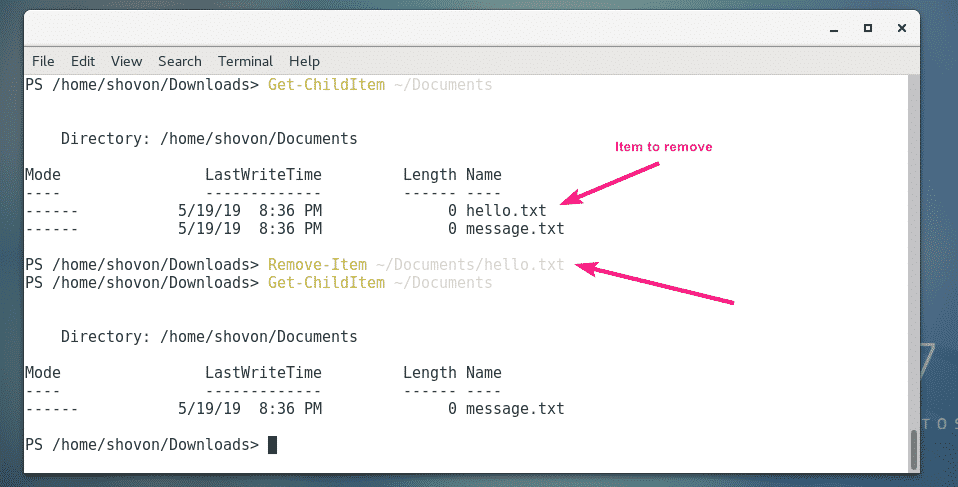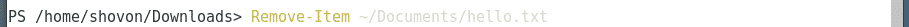 For example, to remove a file ~/Documents/hello.txt, run the Remove-Item command as follows: