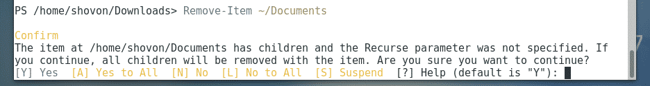 If you try to remove a directory with the Remove-Item PowerShell command, PowerShell will prompt you for confirmation if the directory is not empty as you can see in the screenshot below. Just press one the suggested keys depending on your requirement and press <Enter> to execute the command.