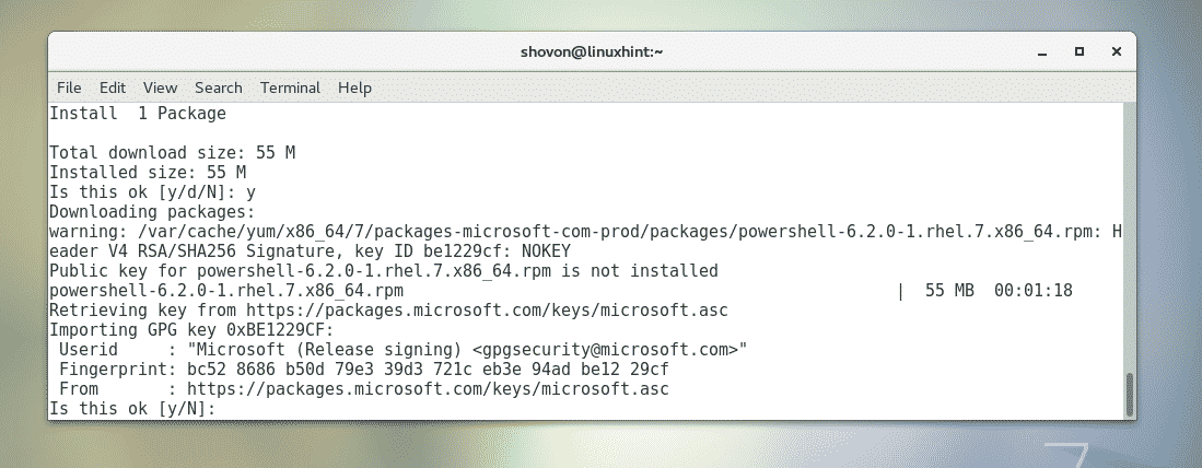 You may be asked to accept the GPG key of the Microsoft package repository. To do that, press y and then press <Enter>.