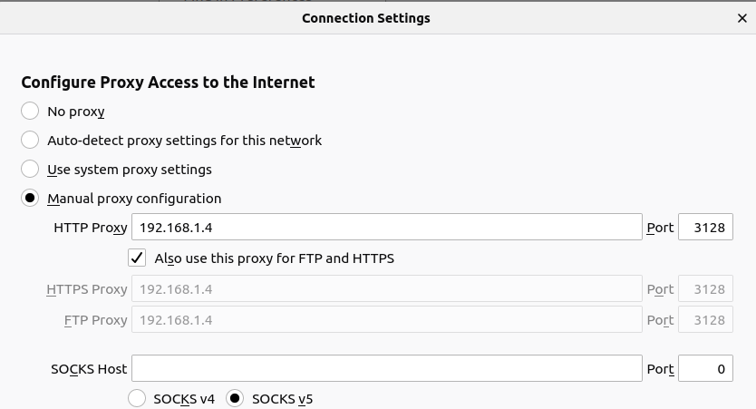 A new window will open up. In “Configure Proxy Access to the Internet” section select “Manual proxy configuration”. The text box labelled as “HTTP Proxy” but the Squid proxy server’s IP address. The in-text box labelled as Port, enter the port number you specified in “http_port” inside the squid.conf file.