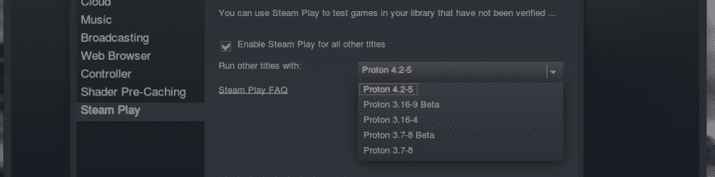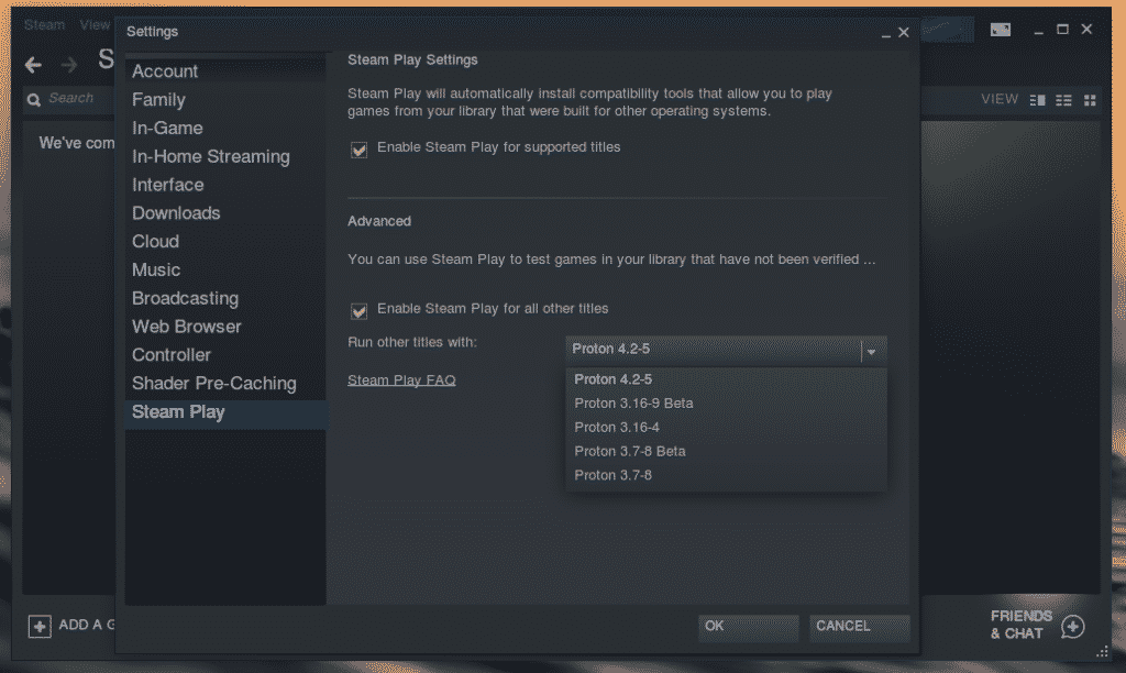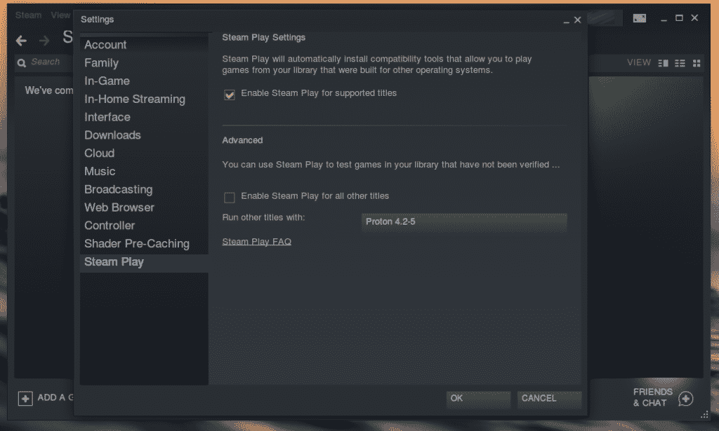 Now, enable Proton from Steam. Go to Steam >> Settings >> Steam Play (from the left panel).