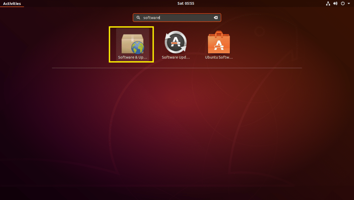 Go to the Application Menu and search for Software & Updates. Now click on the marked icon in the screenshot below.
