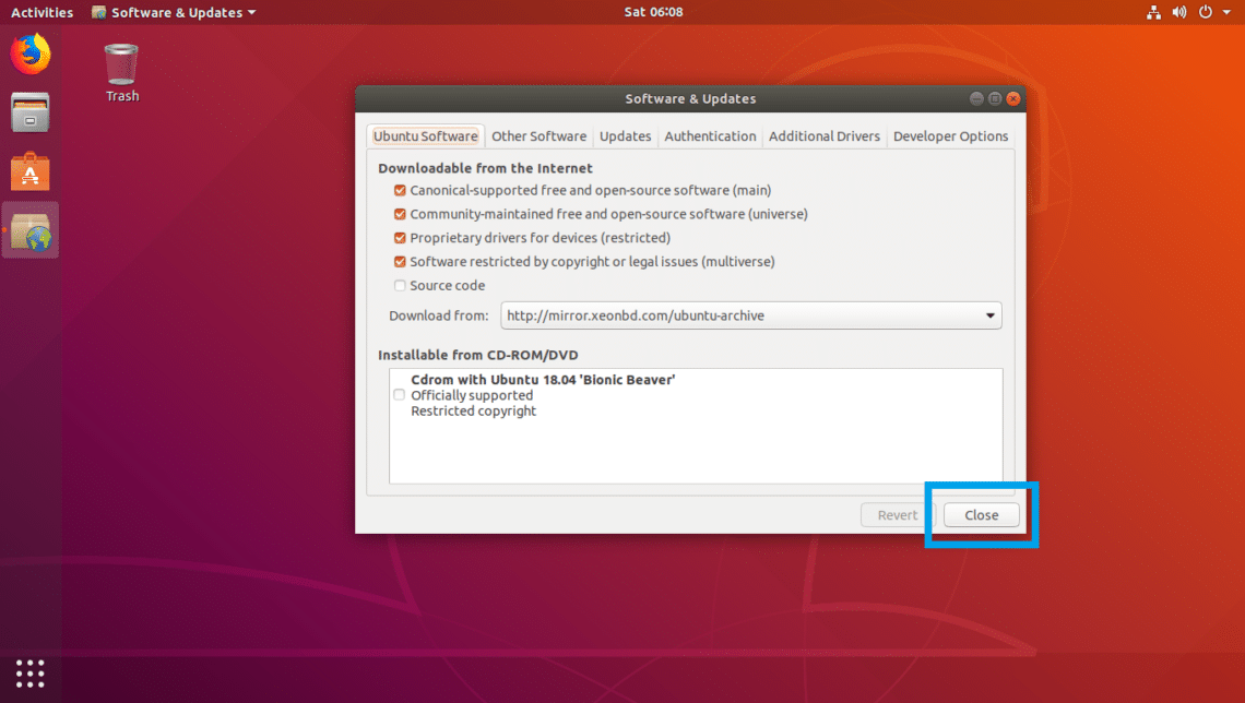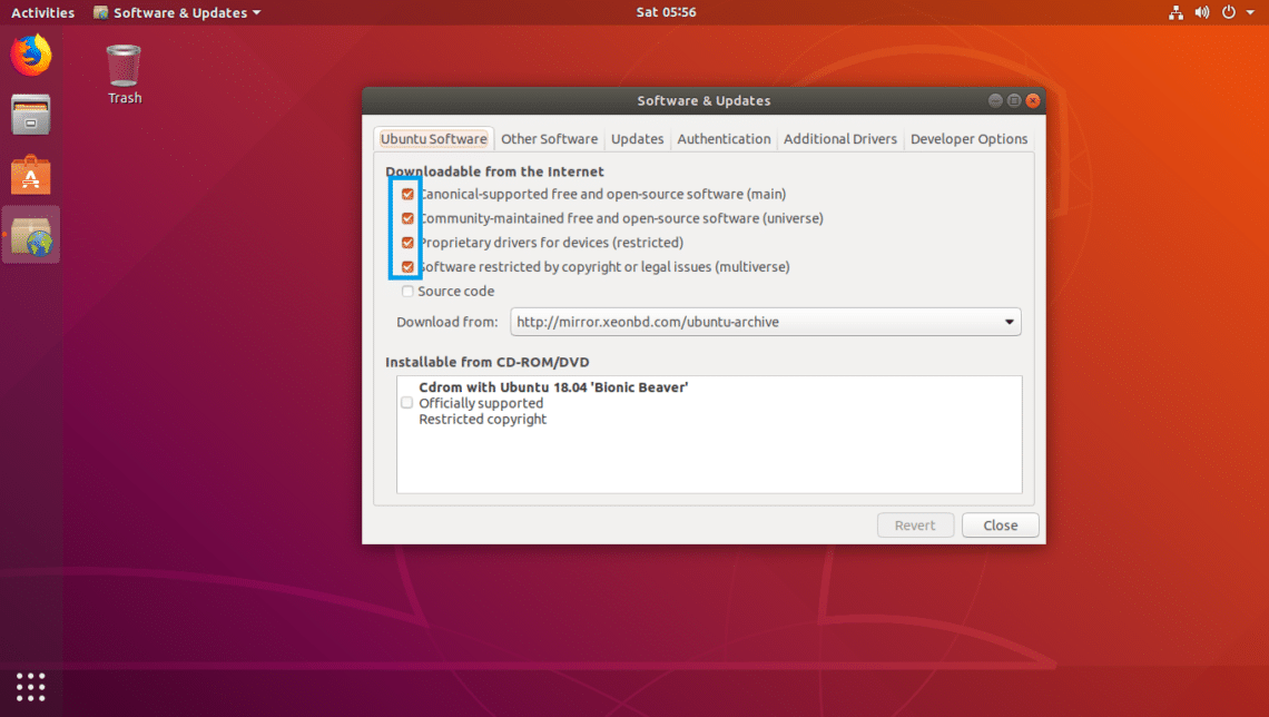 The Software & Updates app should open. Now make sure the marked checkboxes are selected. If they are not, just click on them. They should be selected.