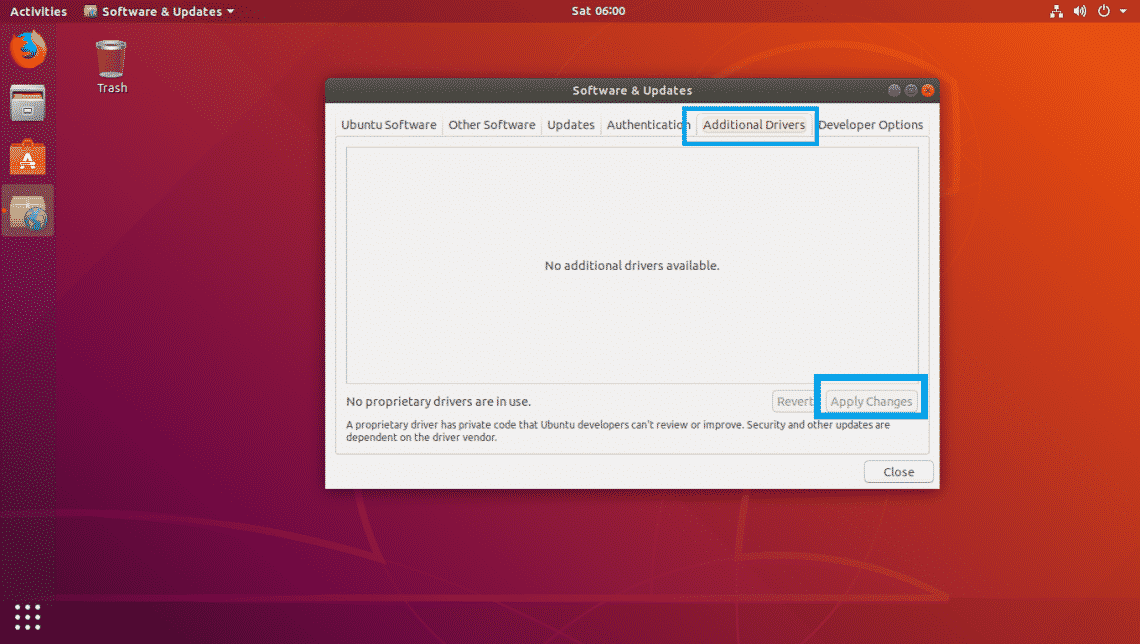 Now go to the Additional Drivers tab of Software & Updates app. If you’re using any proprietary drivers, you should see it here. Just select it and then click on Apply Changes, it should be installed. I don’t have any dedicated graphics card installed on my virtual machine. So it shows nothing.