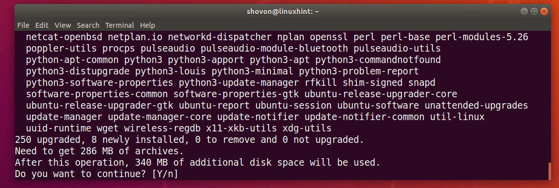 If you have any updates available, you should see the following prompt. Press y and then press <Enter> to continue.