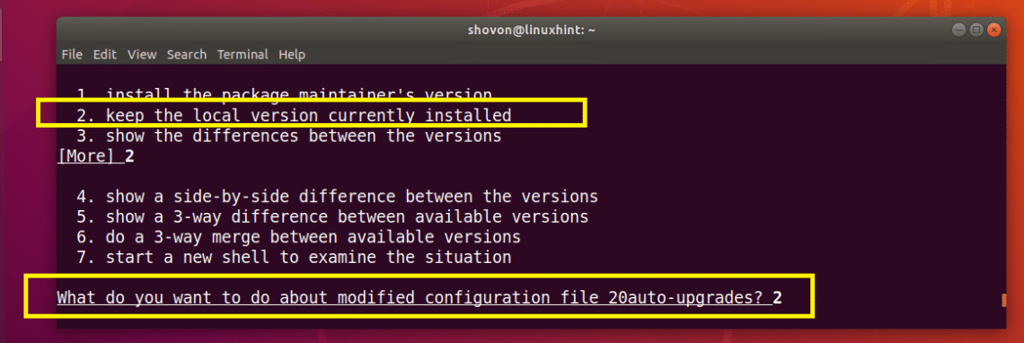 It may ask you whether you want to keep a local copy of 20auto-upgrades file, just press 2 and then press <Enter>. The installation should continue.