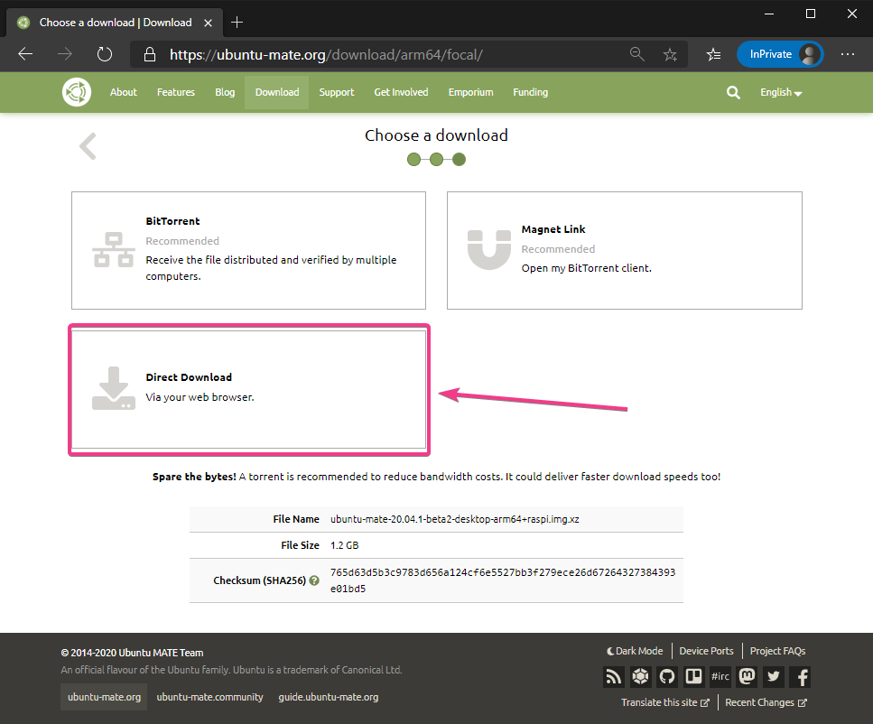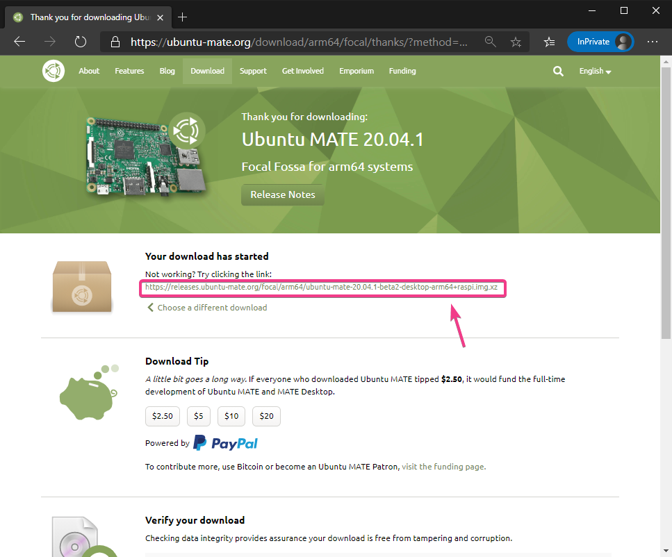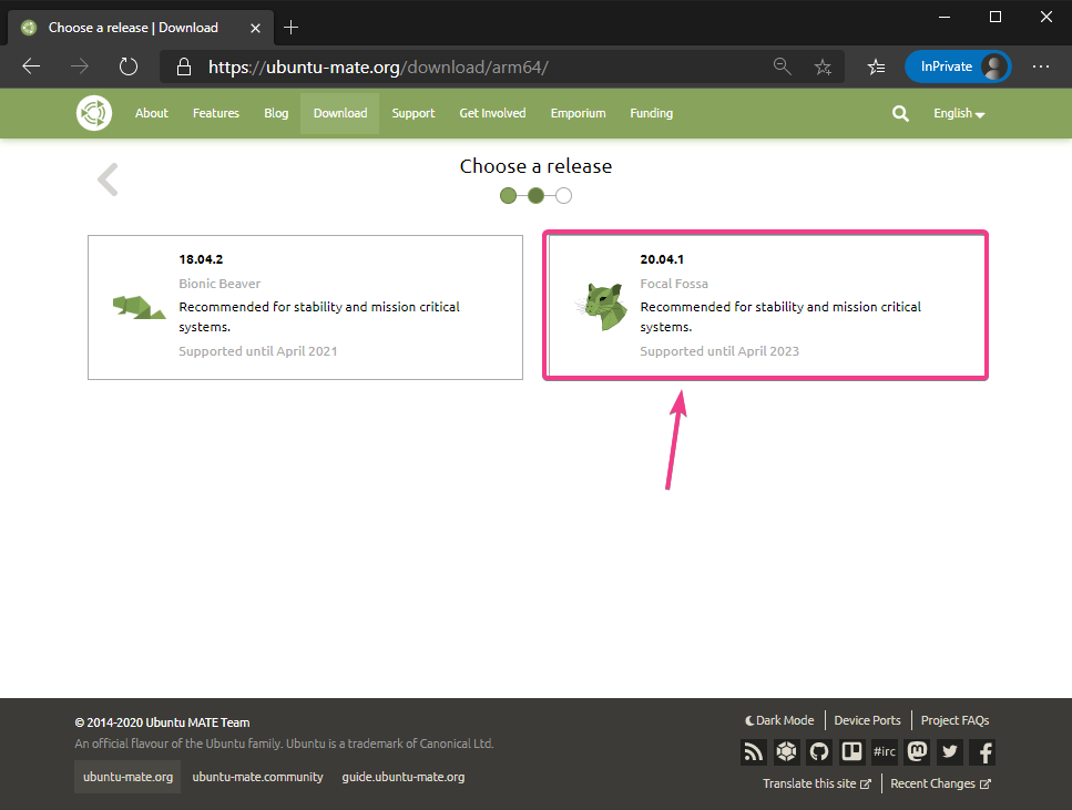 At the time of this writing, the latest version of Ubuntu MATE available for Raspberry Pi is 20.04.1. So, click on the 20.04.1 version link.