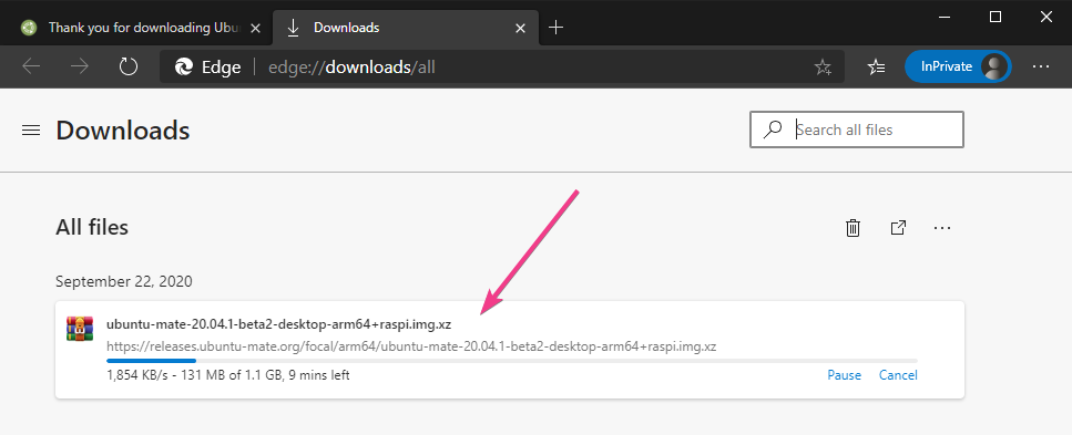 Your browser should start downloading the Ubuntu MATE 20.04.1 Raspberry Pi image. It may take a while to complete.
