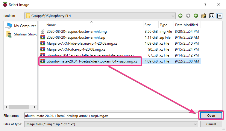Select the Ubuntu MATE 20.04.1 Raspberry Pi image that you have just downloaded and click on Open.