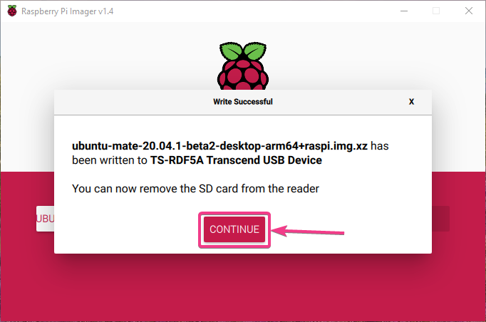 At this point, the Ubuntu MATE 20.04.1 Raspberry Pi image should be flashed on to the microSD card. Click on CONTINUE and close Raspberry Pi Imager. Then, remove the microSD card from your computer.