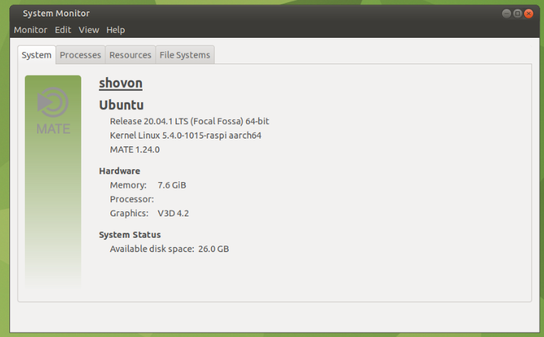 As you can see, I am running Ubuntu MATE 20.04.1 LTS (64-bit version) on my Raspberry Pi 4 8GB version. I have used a 32 GB MicroSD card for installing Ubuntu MATE 20.04.1 LTS. Still, about 26 GB of disk space is free.