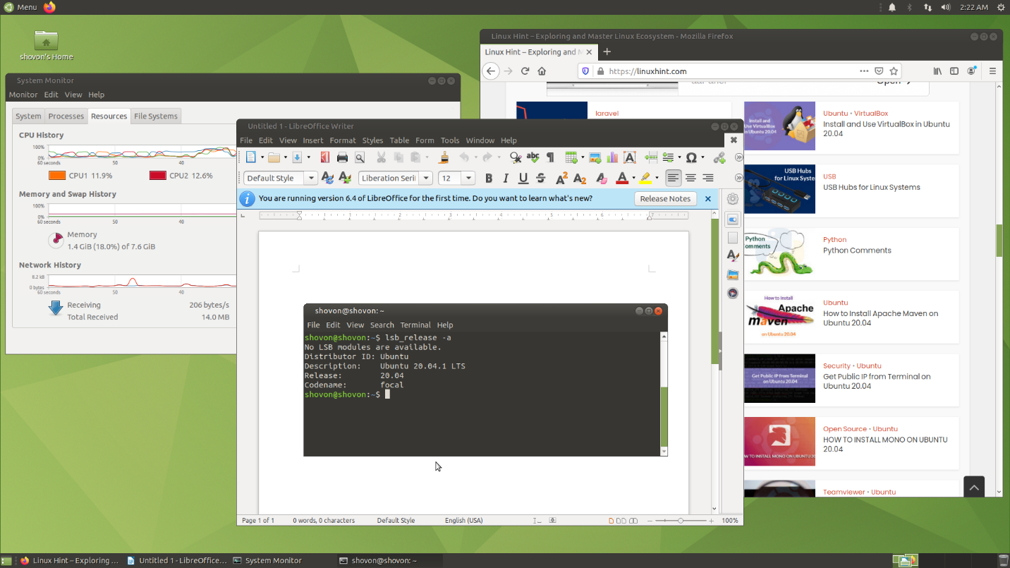 Multi-tasking on Raspberry Pi 4 using Ubuntu MATE 20.04.1 LTS operating system is also possible. It works wonderfully as you can see in the screenshot below. I did not face any lag. The user-interface of the MATE desktop environment was smooth and very useable even when multi-tasking.