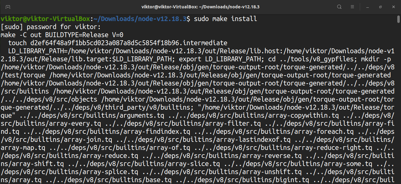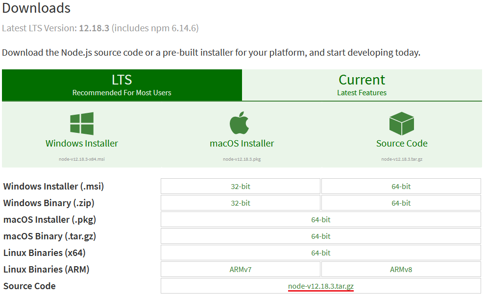 Now, download the source code. In this example, I’ll be compiling the Node.js v12.18.3 (includes npm 6.14.6). Download Node.js source code.