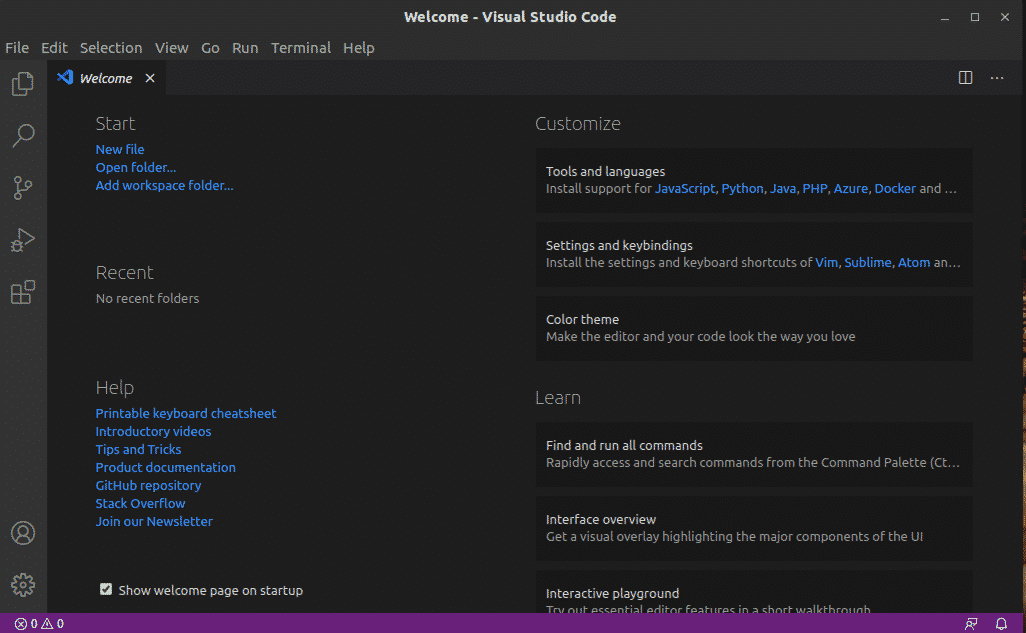 After launching for the first time, VS Code will show you the welcome page. The editor is now good to go.