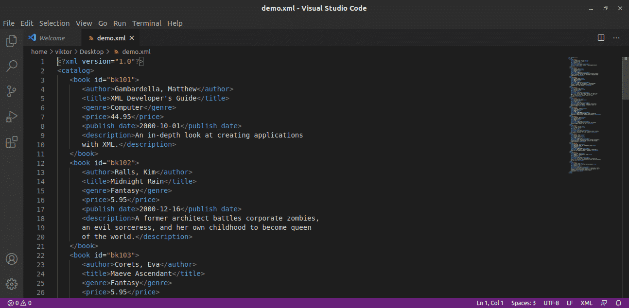 This is what working with VS Code looks like. This example is a sample XML document provided by Microsoft.