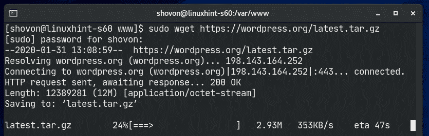 wget is downloading WordPress archive. It may take a few minutes to complete.