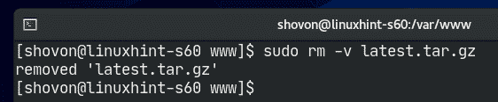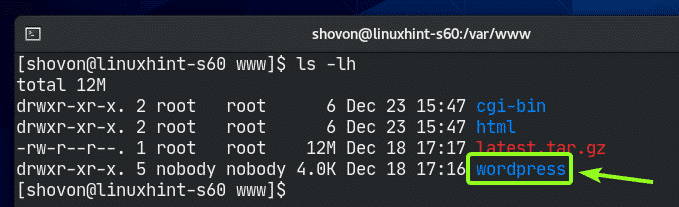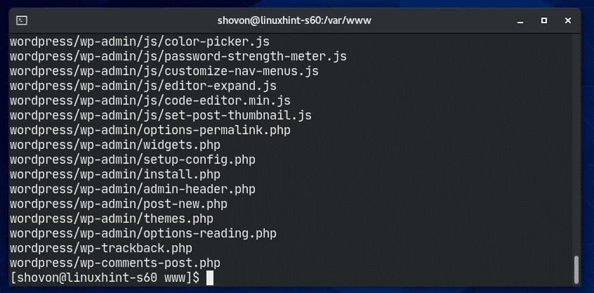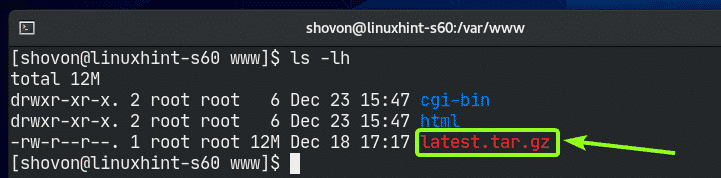 The WordPress archive file latest.tar.gz should be in the /var/www directory as you can see in the screenshot below.