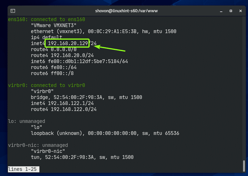 As you can see, the IP address of my CentOS 8 machine is 192.168.20.129. It will be different for you. So, make sure to replace it with yours from now on.