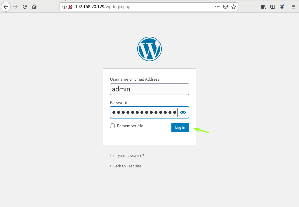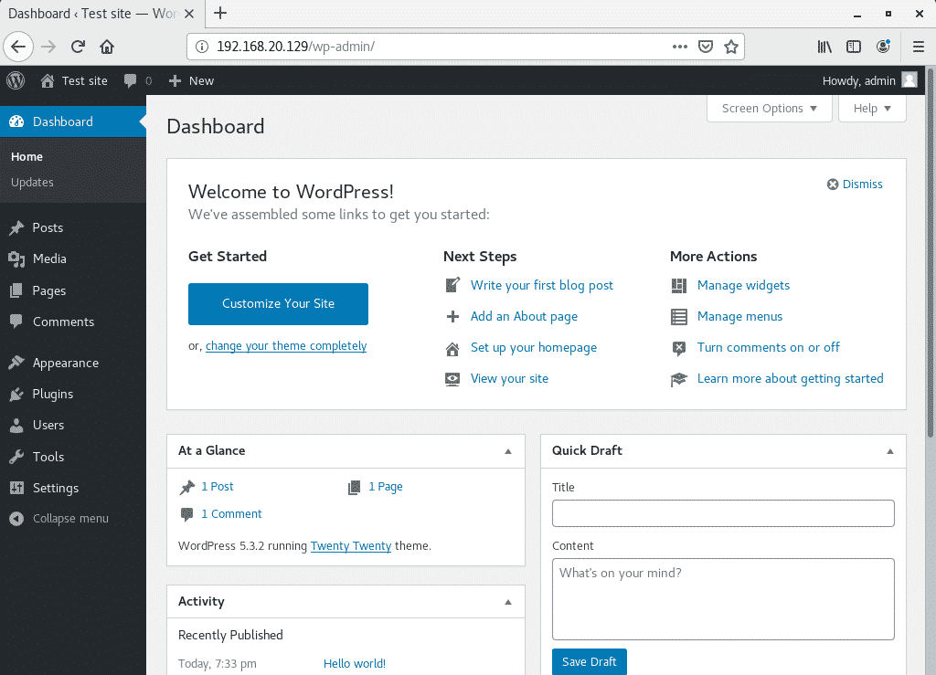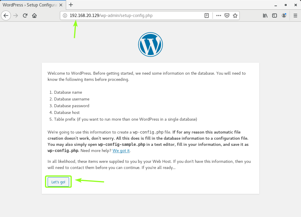 Now, open your favorite web browser and visit http://192.168.20.129. You should see the following page. Click on Let’s go.