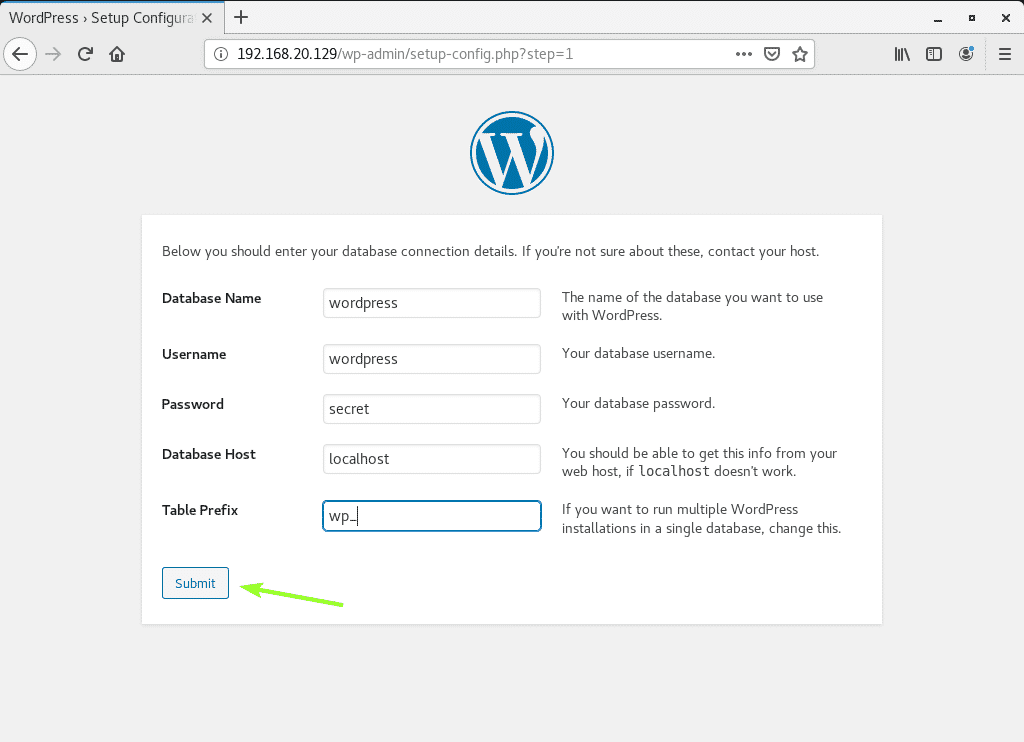 Now, type in the MariaDB database information (i.e. Database Name, Username, Password). Leave the Database Host and Table Prefix as it is if you don’t know what they are. Once you’re done, click on Submit