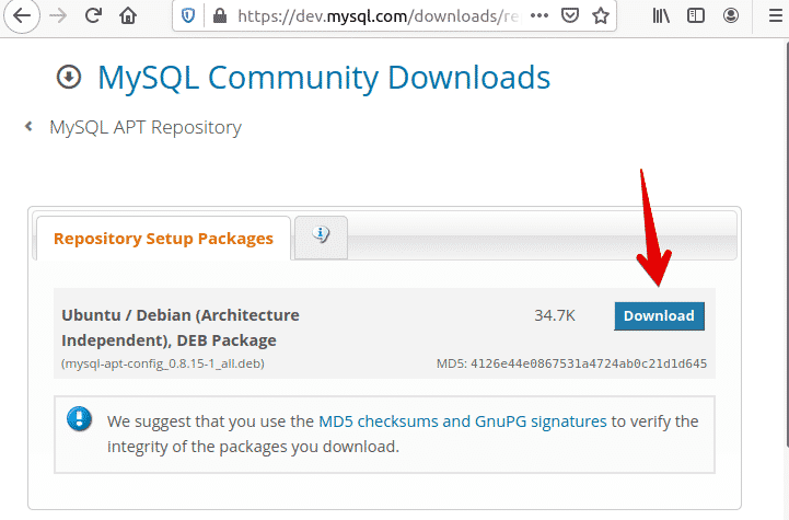 Using this method, you can install MySQL from the official apt repository. For this purpose, download the repository configuration file from the given URL https://dev.mysql.com/downloads/repo/apt/. When you browse this URL, it will take you directly on the download page from where you will download ‘mysql-apt-config_0.8.15-1_all.deb’ repo configuration file. Click on the Download option.