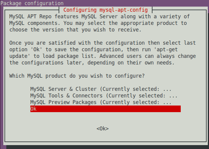 During the installation, you will be asked to choose the version of MySQL. Here, it is preselected. Therefore, select OK by navigating the down arrow key and then hit ‘Enter’ from your keyboard.