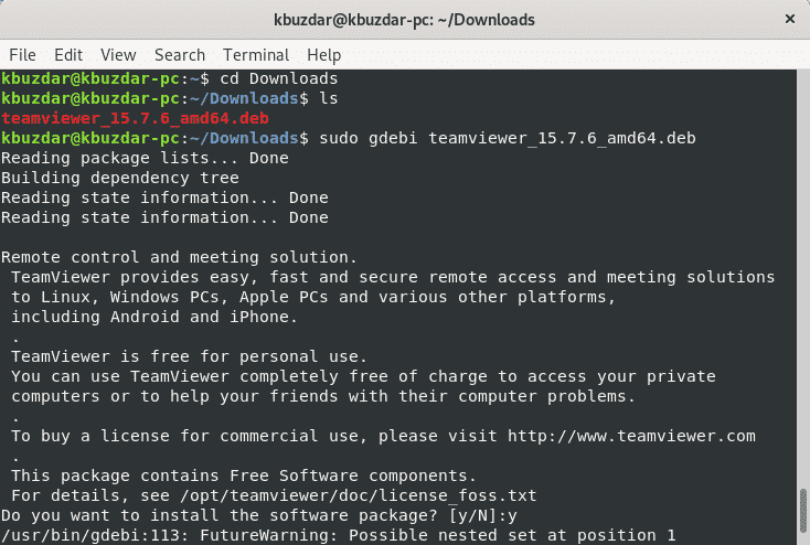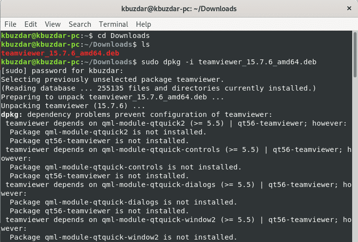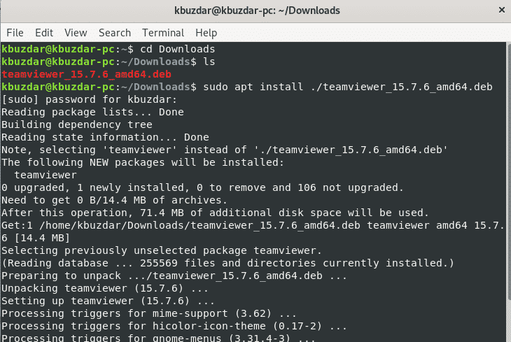 Here, we have downloaded the .deb file of TeamViewer for giving you a demo. So, use the following command to install any using dpkg: