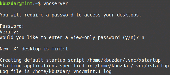 You will be prompted to set a password for the VNC server. Enter the password and then confirm it by entering it again. Then you will be asked that if you want to enter a view-only password, hit n. If you press y, you will not be able to use the mouse and keyboard for controlling the VNC instance.