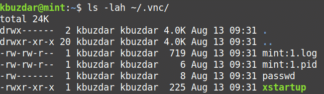 When you run the “vncserver” command for the first time, it creates a new directory “.vnc” under your Home directory. To view this directory, you can issue the following command in Terminal: