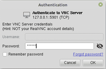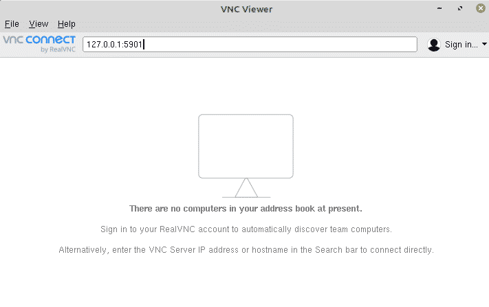 Now install VNC client application (VNC viewer )on your system and launch it. In the top bar of a VNC viewer, type 127.0.0.1:5901, and press Enter.