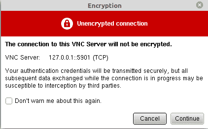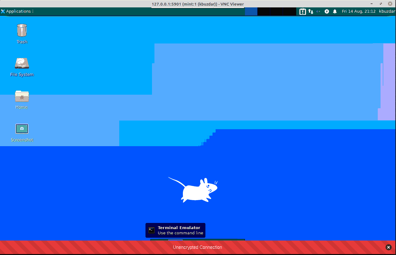 VNC server connection has successfully established now. Once you are finished, close the VNC viewer application and also kill the SSH tunnel by using the Ctrl+c in the Terminal window. If you need to connect to the VNC server again, first create the tunnel and then connect to the VNC server using the VNC viewer application.
