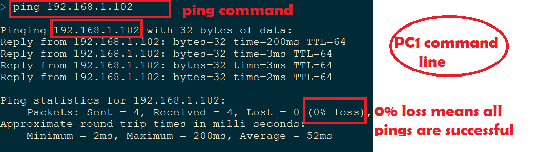 - PC1 should ping to PC2 and vice versa. We can use ping 192.168.1.102 from PC1 console or command line to see if PC1 is able to reach PC2. Do ping from PC2 to PC1 to check the reachbility of PC1 from PC3.