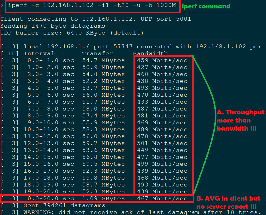 - After UDP client throughput is completed, we should not any server report for average. Check the point B in below screenshot.