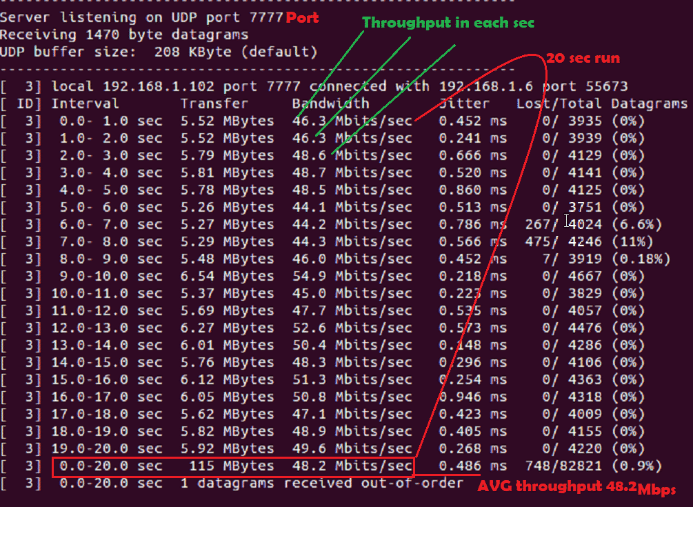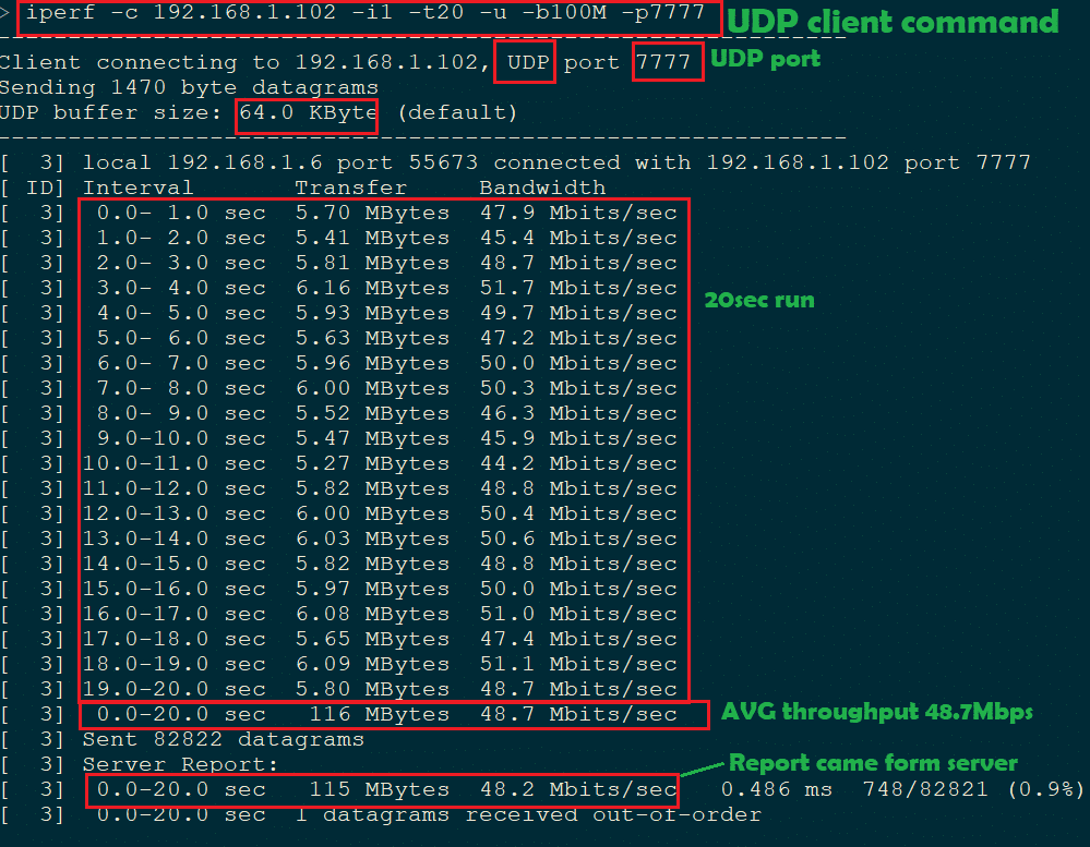Note: UDP does not establish any UDP connection before transferring data and UDP does not need any ACK from other side. So even if IPERF server is not running client will able send data unlike TCP. So always check in server side for UDP data.