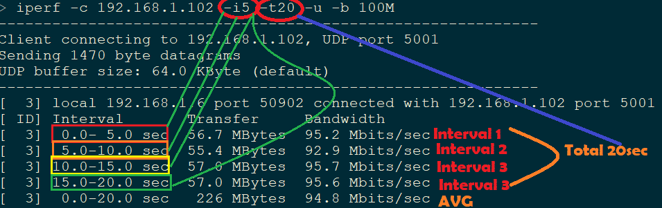 Here –t 20sec and –i 5sec so we should see Iperf output at 5sec interval. Here is the screenshot.