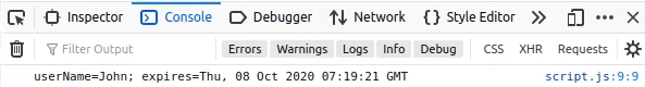 Now, if we want to have a look at the Cookie, we can get the cookie by assigning document.cookie to a variable and then console it.