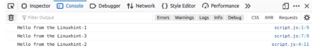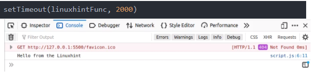 Next, we call linuxhintFunc in setTimeout and provide a time delay of 2000 ms (2 s).