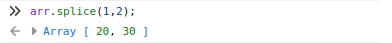 To remove the elements 20 and 30 (at position 1 and position 2 in the array, respectively) from the array, we simply call the splice function and tell it to start from the first index and remove 2 elements.