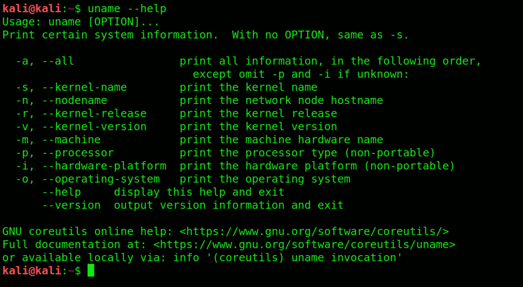 1. uname: Get detailed info on your system specifications with this command. Great place to start familiarizing yourself with Kali User Interface.