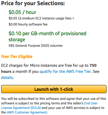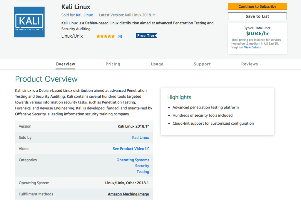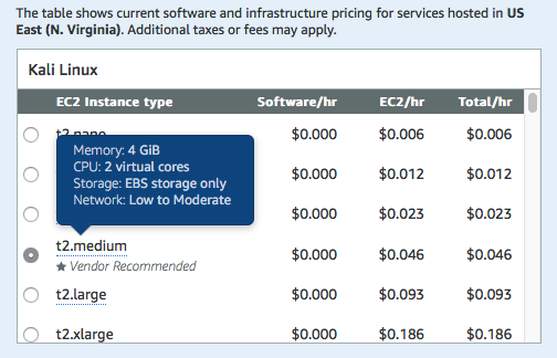 It is useful to note that the default recommended instance size for Kali Linux is t2.medium, as we can see under pricing information: