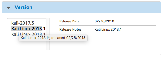 - The version of the AMI that we will use: It is usually recommended to use the latest version of the AMI that is available in the marketplace. Often, this isn’t the one that is selected by default for Kali Linux. At the time of writing, the latest version is 2018.1, and the build date is February 2018, as can be seen here: