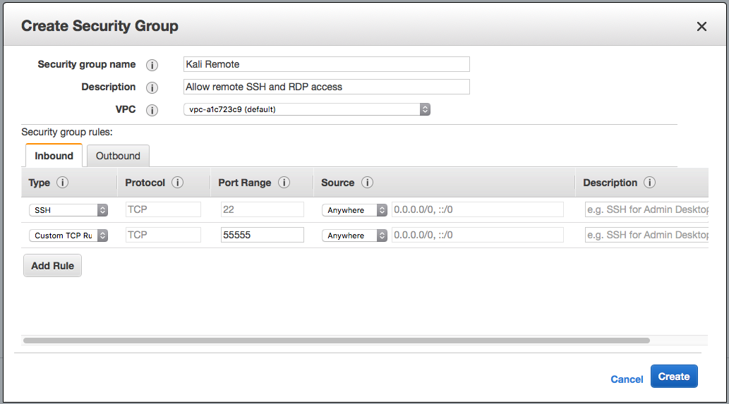 - Security group: Previously, we set up the Security Group in such a way that unauthorized outsiders would not have access to the instances. However, in this case, we need to allow remote access to our Kali instance. Hence, we need to forward the SSH and the Guacamole remote access port to a new Security Group: