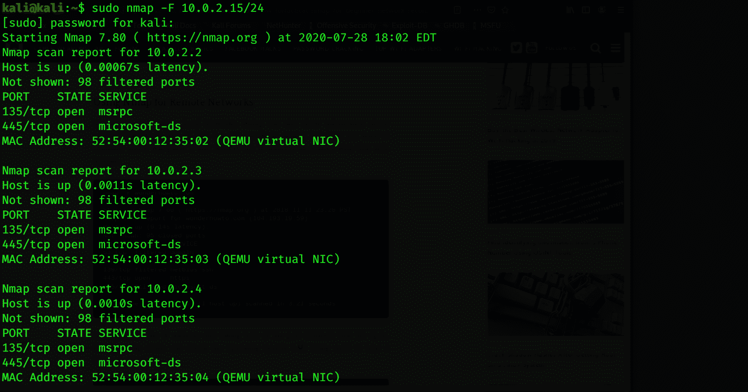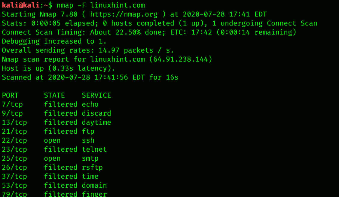 Nmap is a great Network Reconnaissance tool used for scanning the data connected to any device. You can scan all the up servers and systems and check the weaknesses of the network and OS. You can check for live systems, open ports, perform banner grabbing, prepare proxies, view the IP address and the OS version, and other details about the connected device with Nmap. To receive this information, enter the following command: